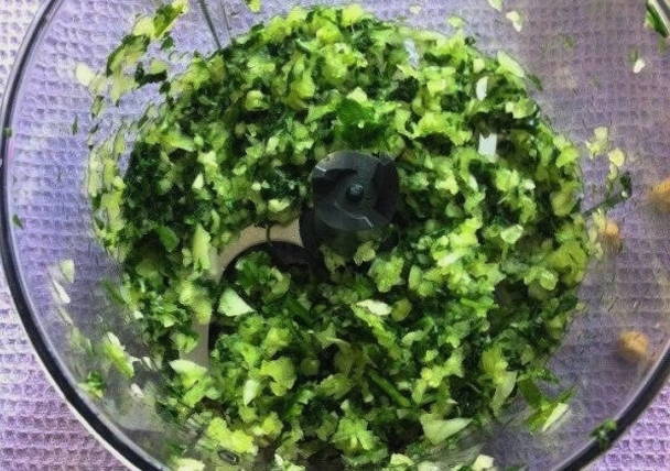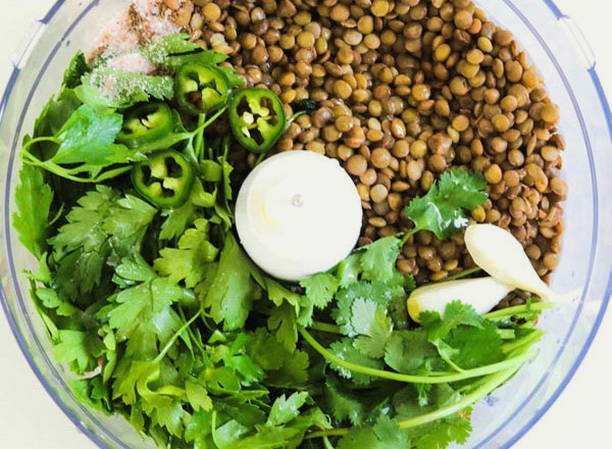 - Dip greens, geweekte linzen, teentjes knoflook, chili en zout in een blenderkom.