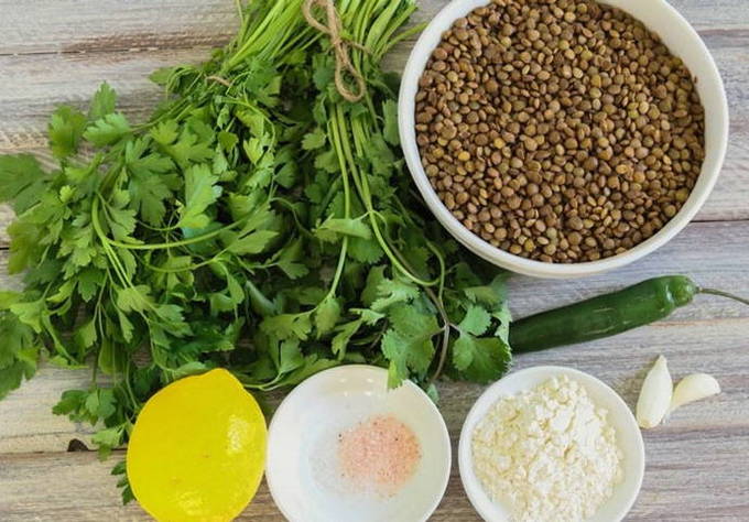 - We zullen alle benodigde producten bereiden voor het maken van zelfgemaakte falafel. Week de linzen vooraf in koud water.