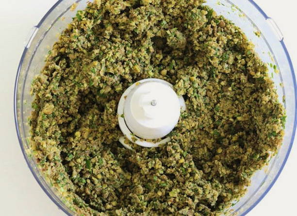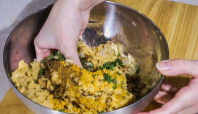 - Maal de kikkererwten en voeg er gesnipperde uien, knoflook, kruiden, zout en specerijen aan toe. Kneed de massa met je handen tot een gladde massa.