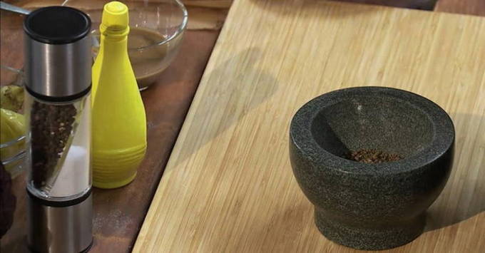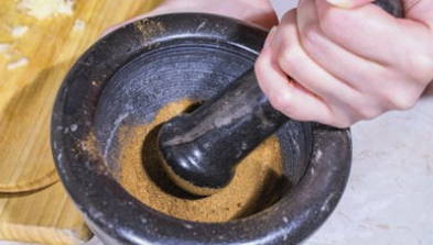 - Maak eerst de falafelkruiden en kneed ze in een vijzel.