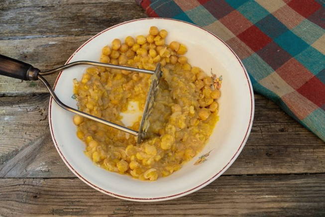 - Om hummus te bereiden, maalt u de gekookte kikkererwten. Roer het met tahini, kruiden, olijfolie en citroensap.