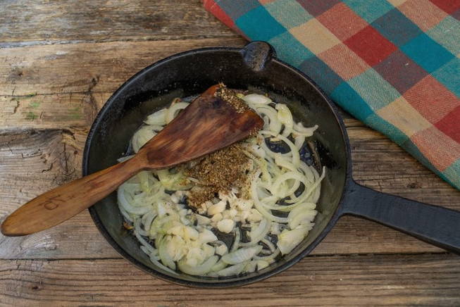 - Fruit in een koekenpan de ui met knoflook en kruiden tot een lichte blos.