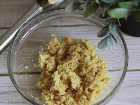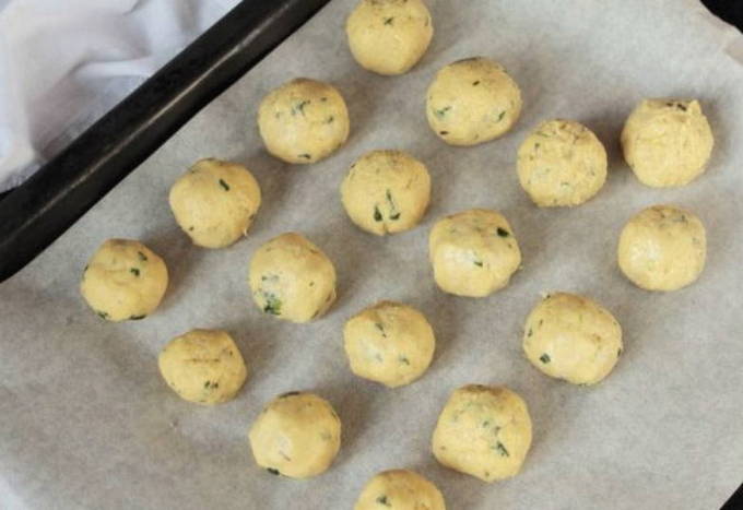 - Van het resulterende deeg maken we kleine balletjes. We leggen ze op een bakplaat met perkament of folie.