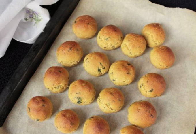 - We boetseren kleine balletjes van het afgewerkte deeg. We verspreiden ze op een bakplaat met perkament.