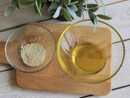 - We sturen olijfolie en sesamzaadjes naar de resulterende puree.