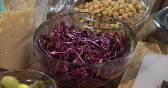 - Snijd de zijkant van de pitabroodje af en bedek de zak met hummus. We zetten hier kool en falafel.