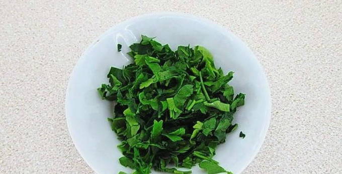 - Vervolgens vullen we het werkstuk aan met gehakte knoflook en dille. Kneed opnieuw tot een gladde massa.