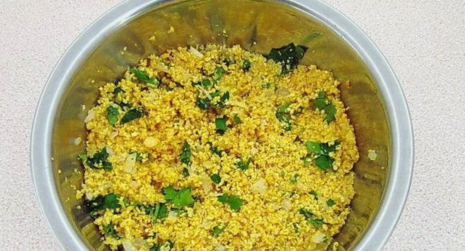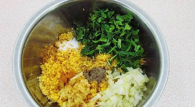 - Voeg gesnipperde ui, knoflook en kruiden toe aan de resulterende pap. We vullen de bereiding aan met zout, kurkuma, plantaardige olie en kneden alles tot een homogeen deeg.