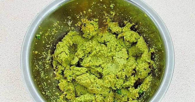- Maal de kikkererwten en voeg er gesnipperde uien, knoflook, kruiden, zout en specerijen aan toe. Kneed de massa met je handen tot een gladde massa.