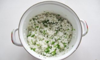 De vulling koken. Rijst moet worden gekookt in gezouten water en afgespoeld zodat het kruimelig is. Hak de greens fijn (peterselie of dille naar smaak), meng met rijst. Breek een ei in rijst, voeg kruiden toe en meng. De vulling is klaar. Verdun voor de saus de zure room met water 2 op 1, voeg kruiden naar smaak toe.