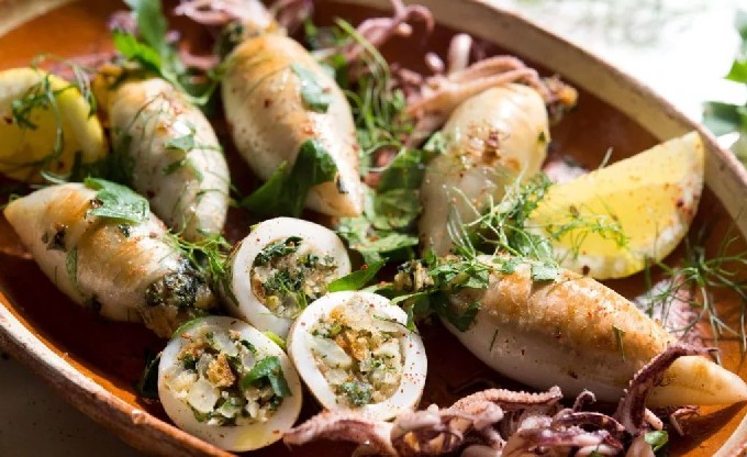 U kunt uzelf herinneren aan warme landen en de zee door te dineren met visgerechten. Probeer een eenvoudig en heerlijk recept voor met garnalen gevulde inktvis.