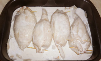- Vul de inktvis met een vulling, vet in met een kleine hoeveelheid zonnebloemolie, bestrooi met kruiden, open randen kunnen worden vastgemaakt met tandenstokers.