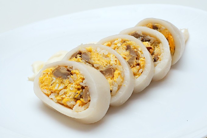 Inktvis gevuld met rijst en spek is een stevig gerecht dat kan worden gebruikt om uw dagelijkse lunchmenu te diversifiëren.