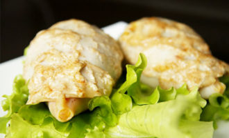 - Hak de peterselie fijn, haal de knoflook door een pers, drie kaas op een fijne rasp. Meng voor de vulling in een aparte kom de kaas, broodkruimels, gehakte knoflook, een halve theelepel zout en zwarte peper, peterselie, breek een ei. Giet er een eetlepel zonnebloem- of olijfolie bij en meng opnieuw goed.