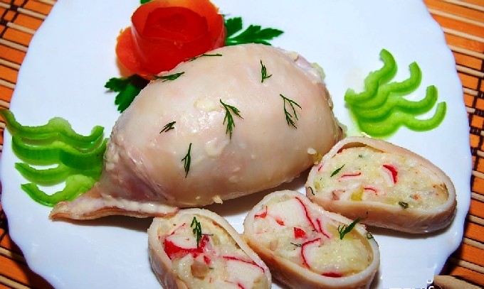 Het is de moeite waard om een keer te proberen te begrijpen dat zeevruchten en vlees kunnen worden gecombineerd. Hier is wit vlees perfect voor het vullen van gevulde inktvis, dan wordt je gerecht niet vettig.