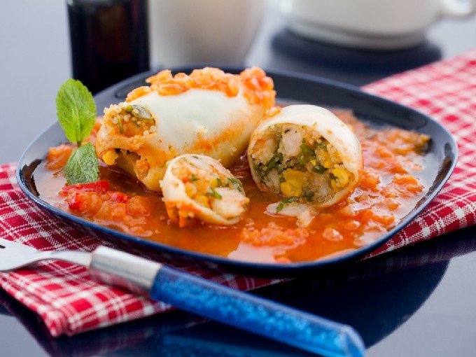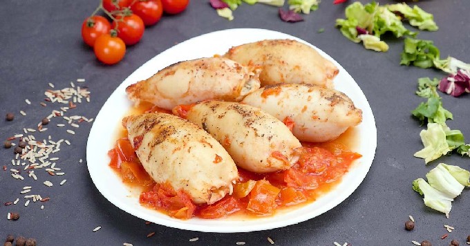 - We vullen de inktviskarkassen niet erg strak met de vulling, sluiten de randen van de karkassen met houten spiesen en sturen ze naar de pan naar de tomatensaus. Laat 10-15 minuten op laag vuur sudderen, draai de inktvis naar de andere kant en laat hem nog 10 minuten onder een deksel op het ingeschakelde fornuis staan. Gefrituurde gevulde inktvis kan worden besprenkeld met citroensap en geserveerd met verse groenten.
