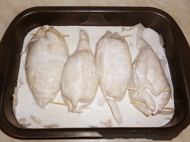 Het is de moeite waard om een keer te proberen te begrijpen dat zeevruchten en vlees kunnen worden gecombineerd. Hier is wit vlees perfect voor het vullen van gevulde inktvis, dan wordt je gerecht niet vettig.