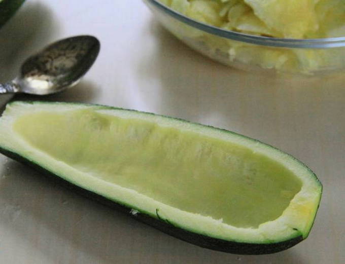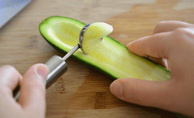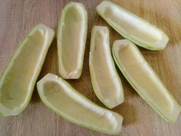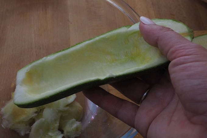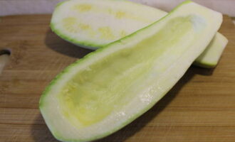 - We wassen de courgette onder stromend water, drogen ze op keukenpapier en snijden ze in twee gelijke delen. Verwijder het vruchtvlees met een theelepel.
