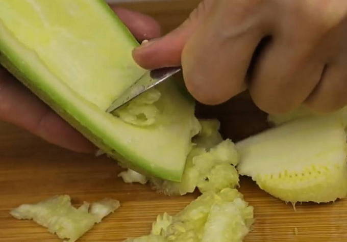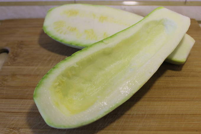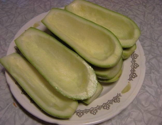 - Om te beginnen spoelen we de courgette grondig af onder stromend water en snijden ze in twee delen. Verwijder met een lepel het vruchtvlees, dat verder in de vulling gaat.