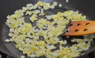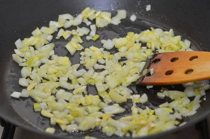 Op dit moment bereiden we de vulling voor waarmee we de courgette gaan vullen. Pel de uien met knoflook en hak ze fijn. Verhit een kleine hoeveelheid plantaardige olie in een koekenpan en bak hierin de groenten tot ze zacht zijn, af en toe roeren.