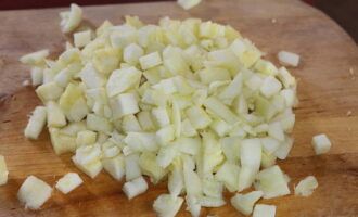 Snijd de resterende courgettepulp in kleine blokjes en stuur ze naar de ui met knoflook. Meng alles en kook nog 5 minuten. Vervolgens schuiven we de gefrituurde groenten in een aparte container.