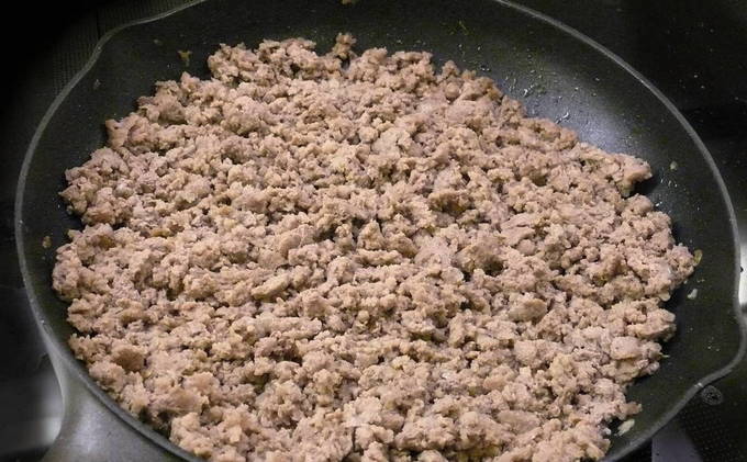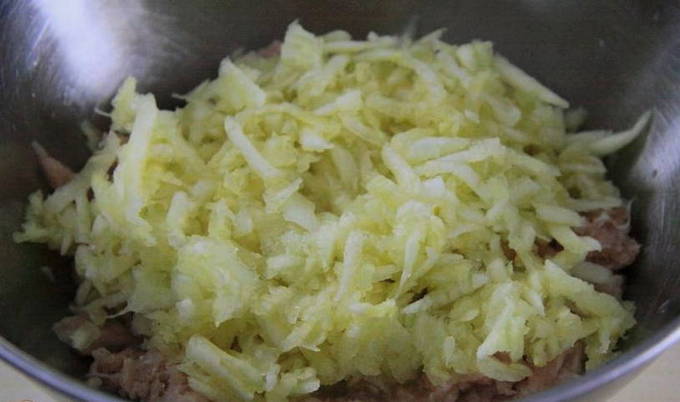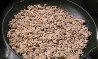 We sturen gehakt naar dezelfde koekenpan. Voeg een beetje meer plantaardige olie toe en bak ongeveer 10 minuten, breek het met een lepel. Laat het gehakt iets afkoelen. Wrijf op dit moment de kaas op een grove rasp en hak de greens fijn. Nu nemen we een geschikte container, sturen het gehakt, gebakken courgette met uien en knoflook, geraspte kaas en kruiden. Voeg naar smaak zout en zwarte peper toe en meng goed.