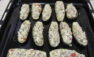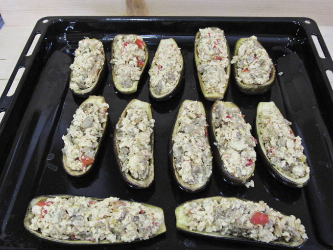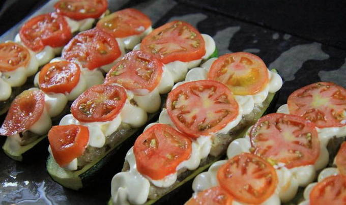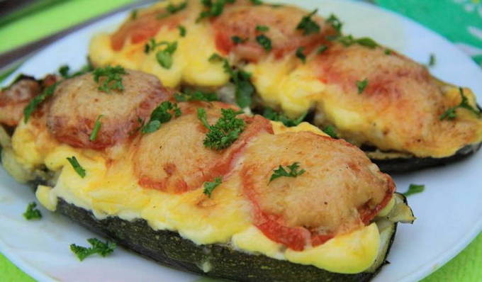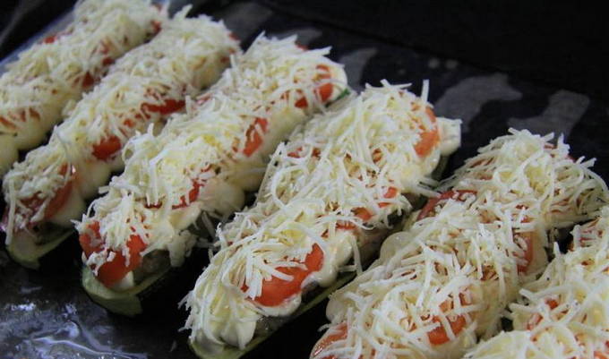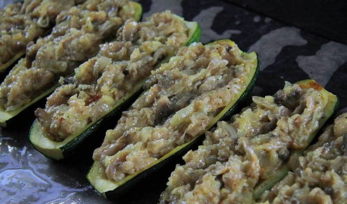 - Vet een bakplaat in met plantaardige olie en leg de courgette erop. We vullen ze met de resulterende vulling. Verwarm de oven voor op 200OC en bak de boten 20-25 minuten.