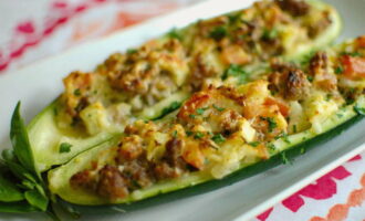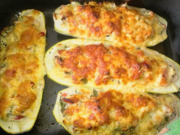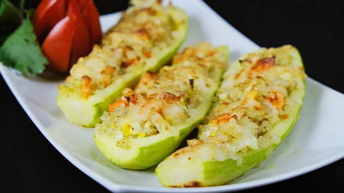 Gekookte rijst wordt gemengd met gehakt, gebakken wortelen met uien en kruiden. De vulling wordt in de courgette gedaan en alles wordt 55 minuten gebakken. Bestrooi alles 10 minuten voor het koken met kaas. Het blijkt een erg lekker en makkelijk te bereiden gerecht.