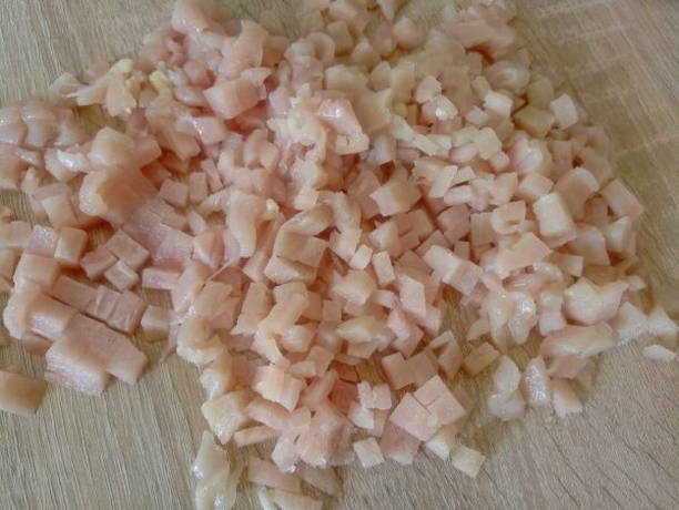 - We wassen ook de kipfilet, drogen hem op keukenpapier en snijden hem in hele kleine blokjes.