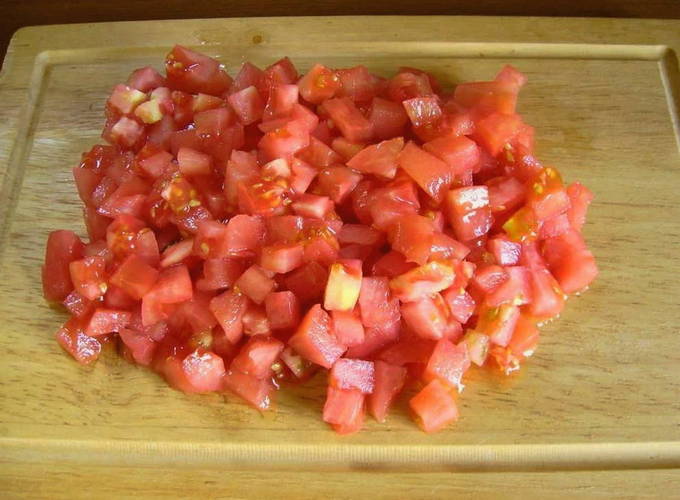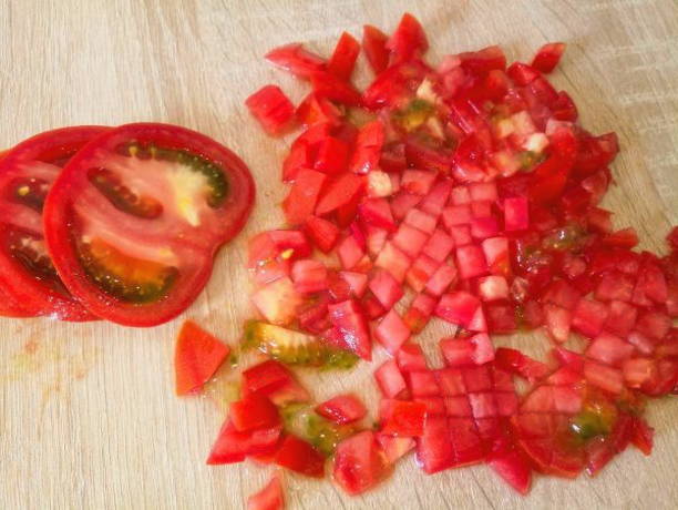 - Snijd de gewassen tomaat in dezelfde blokjes als de kipfilet.