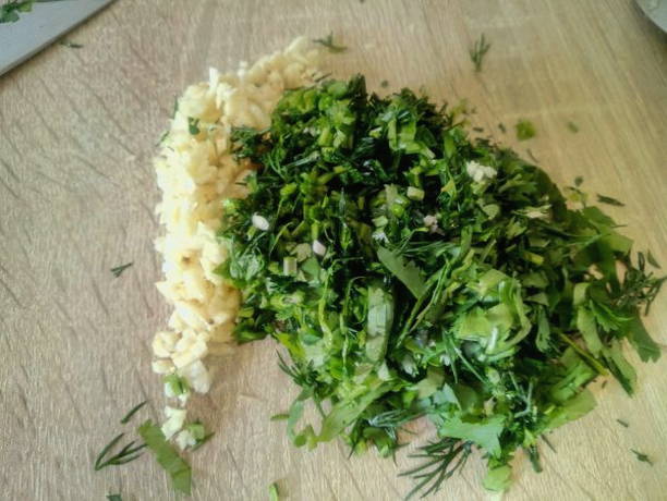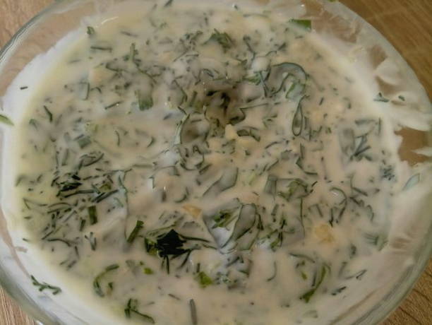 - We sturen yoghurt in een aparte container (deze kan worden vervangen door magere zure room), voeg gehakte kruiden met knoflook toe en meng goed.