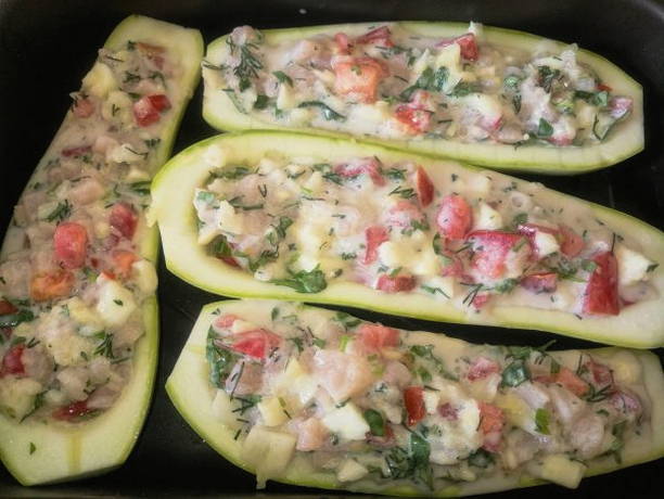 Gehakt kip wordt gemengd met mergpulp, gebakken uien met champignons en kruiden. De vulling wordt in boten gedaan, alles wordt erop gegoten met mayonaise, waarop tomaten en kaas worden gelegd. Courgette wordt 40 minuten gebakken en geserveerd.