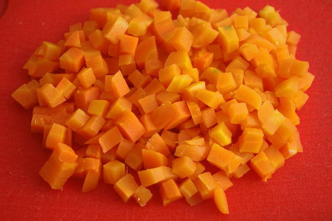 - We wassen de wortels, schillen en snijden ze in kleine blokjes. Verwijder de steel met zaadjes van de paprika en snijd hem op dezelfde manier als wortelen.