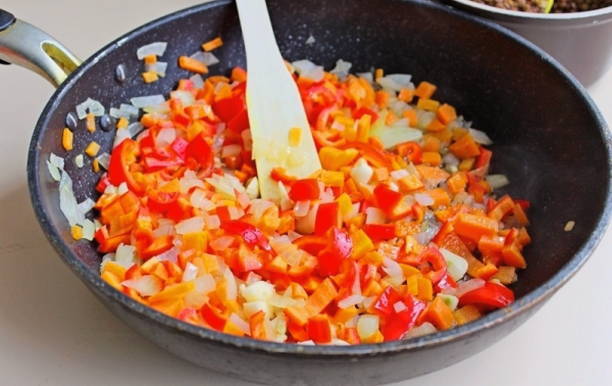 - Verhit wat plantaardige olie in een koekenpan en fruit hierin wortelen, paprika, bloemkool en uien. We persen de gepelde knoflook met een pers en sturen deze met groenten naar de pan. Voeg na 5 minuten gehakte tomaten- en courgettepulp toe aan de rest van de ingrediënten. Voeg zout en peper naar smaak toe, roer en laat 5-10 minuten sudderen tot alle vloeistof is verdampt.