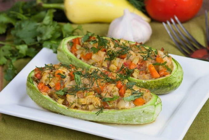 Tomaten, wortelen, bloemkool, paprika en courgettepulp worden in een pan gebakken. De resulterende vulling wordt in de boten gelegd en alles wordt 30-35 minuten gebakken. Het blijkt een erg lekker en licht gerecht te zijn.