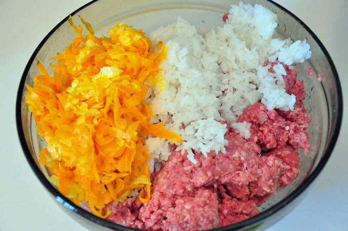 - We sturen gekoelde rijst, gebakken groenten en varkensgehakt naar een geschikte kom. Voeg naar smaak gehakte dille, paprika, zout en zwarte peper toe. We gieten er ook 150 ml koud water bij om onze vulling sappig te maken. Mix alles goed tot een glad geheel.