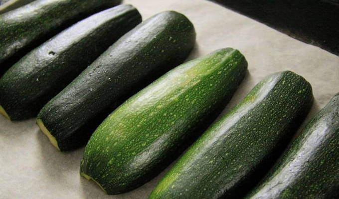 - Bekleed een bakplaat met bakpapier en leg de courgette erop. Verwarm de oven voor en bak 15 minuten op 180OC. Hierdoor wordt de courgette malser en sappiger.