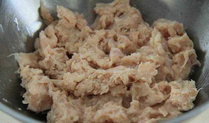 - Op dit moment schuiven we de gehakte kip in een diepe kom.