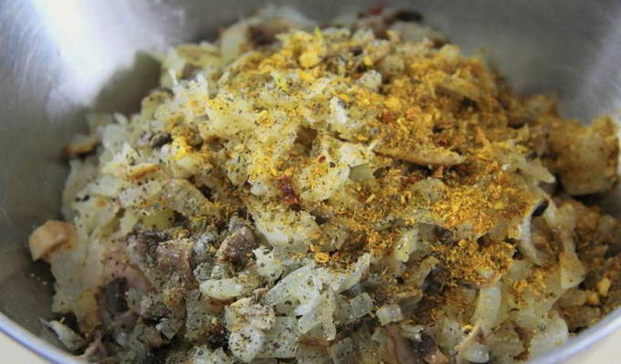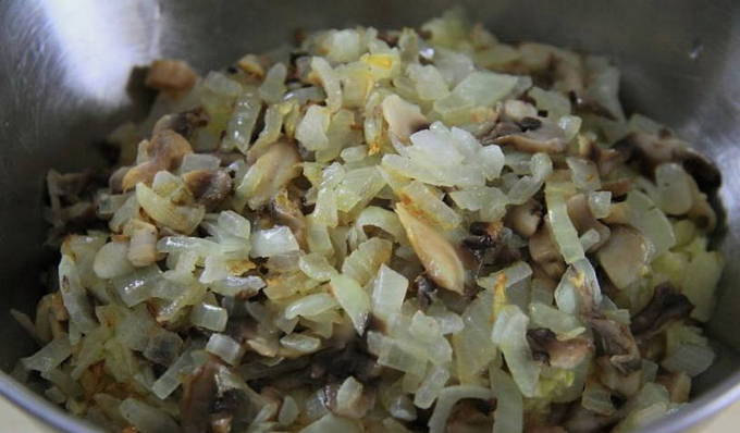 - Schil en hak de uien fijn. Bak het in plantaardige olie samen met de champignons tot ze gaar zijn en stuur het naar de gehaktcontainer.