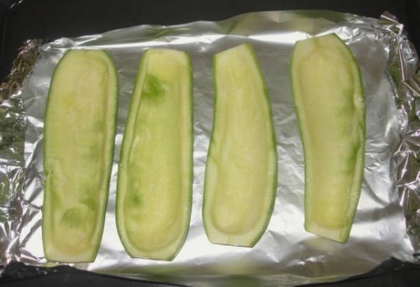 Was de courgette eerst onder stromend water, droog ze af op keukenpapier en snijd ze doormidden. Verwijder met een theelepel het vruchtvlees van elke helft. Laat een laag van ongeveer 8-10 mm aan de randen. Vet een bakplaat in met plantaardige olie, leg de courgette erop, schil. Verwarm de oven voor op 180 ° C en stuur groenten daar 15-20 minuten.