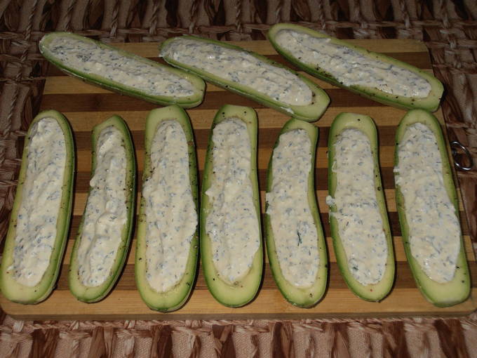Het vruchtvlees wordt uit de courgette gehaald en de vulling van kwark, eieren, dille, knoflook en zout wordt erin gedaan. Bestrooi alles met kaas en bak 40 minuten. Het blijkt een zeer smakelijk gerecht met een rijke smaak.
