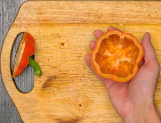 - Snijd de peper overdwars door zodat er een soort glas ontstaat met een deksel. Verwijder de zaadjes uit de binnenkant van de groenten.
