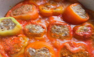 - De paprika's worden met de resulterende saus gegoten, zodat tweederde van het volume van de gevulde groenten in de vloeistof zit.