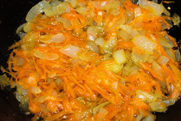 - Je moet frituren van wortels en uien koken: de wortels worden ingewreven, de helft van de ui wordt in kleine blokjes gesneden en alles wordt gebakken in een frituurpan in plantaardige olie.