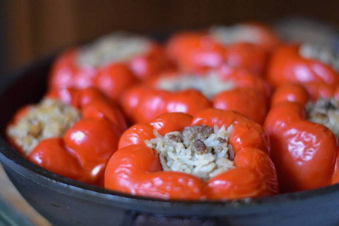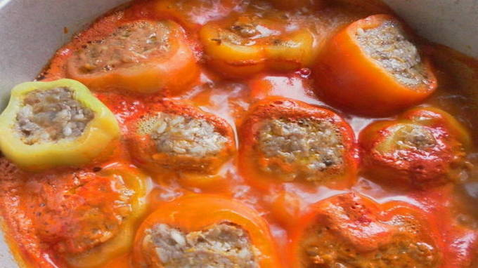 Gevulde paprika's kunnen ook in een gewone pan worden gestoofd: het is belangrijk om de groenten niet te gaar te koken, zodat ze hun vorm en structuur behouden en ook zodat rijstkorrels en stukjes vlees in de schaal worden gevoeld.