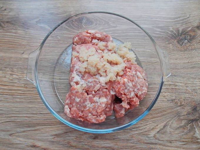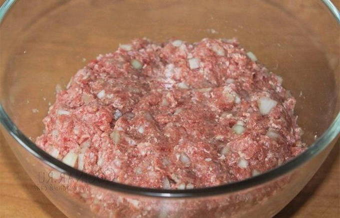 - Meng het gehakt met rijst, gesnipperde uien en peterselie, voeg een beetje water, zout en kruiden toe.