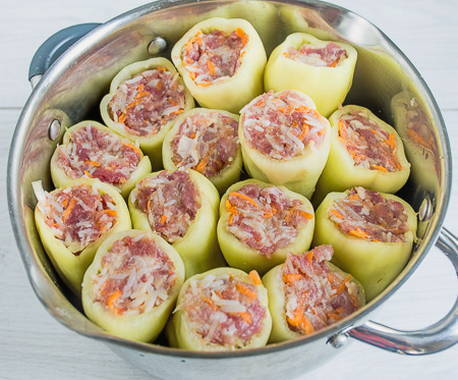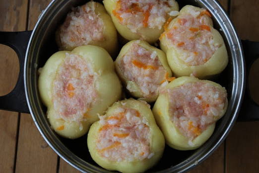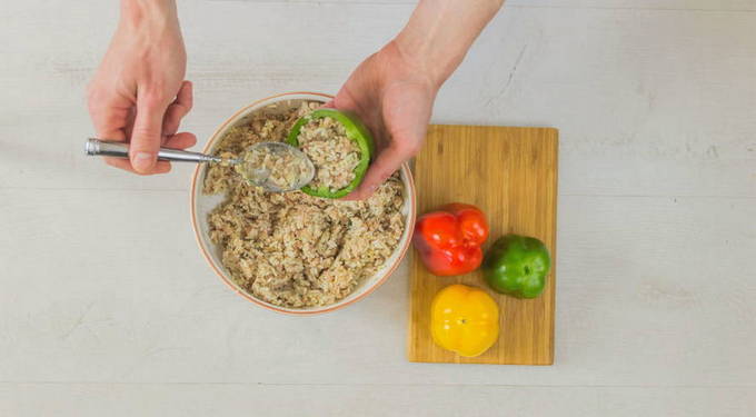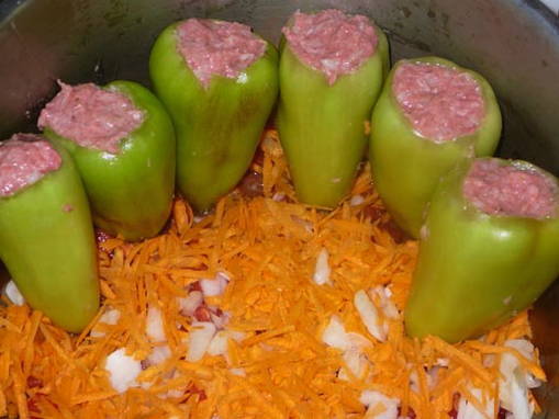 - Plaats de rijst- en vleesvulling in de paprika's, gepeld van zaden en interne tussenschotten. Zet de paprika's in hittebestendige vorm voorzichtig stevig tegen elkaar, overgiet met gezouten heet water en kook op middelhoog vuur gedurende 10 minuten.