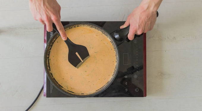 - Gehakte knoflook en de rest van de ui, evenals het tweede deel van de greens worden apart gebakken, voeg room en tomatenpuree toe, breng op smaak met de juiste hoeveelheid zout en peper. De saus moet ongeveer 7 minuten op laag vuur worden gekookt.