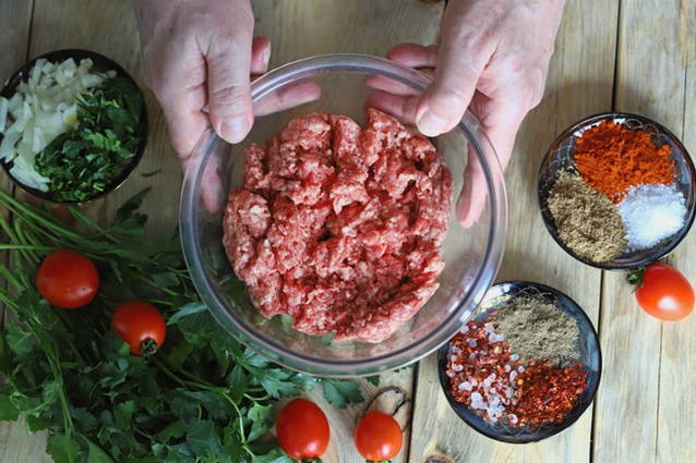 - Voeg de benodigde hoeveelheid kruiden, zout en peper toe aan het gehakt.
