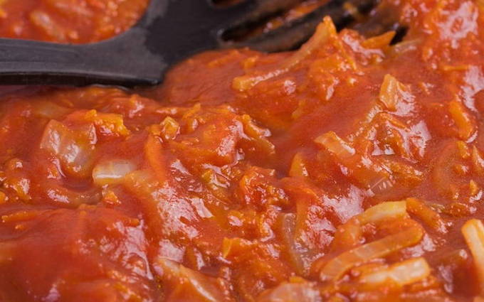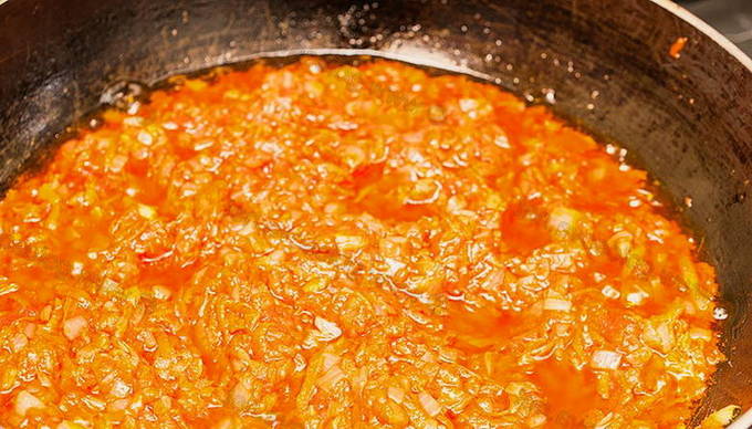 - Bereid frituren in olijfolie van gesnipperde uien, wortelen en knoflook. Bak groenten ongeveer 7-10 minuten.Leg er daarna een fijngesneden tomaat, tomatenpuree, zout, peper en paprikapoeder op. Voeg water toe aan de groentemassa en laat de saus een paar minuten sudderen.
